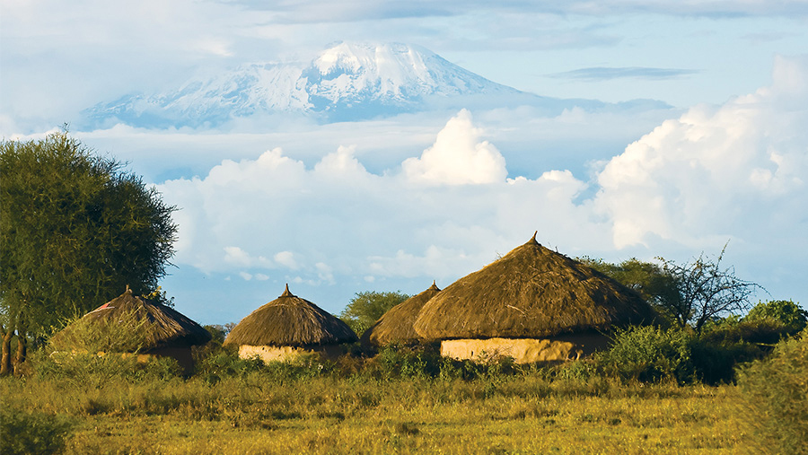 Emerging from the clouds is the domed summit of Mount Kilimanjaro. Tanzanite is mined in its shadow.