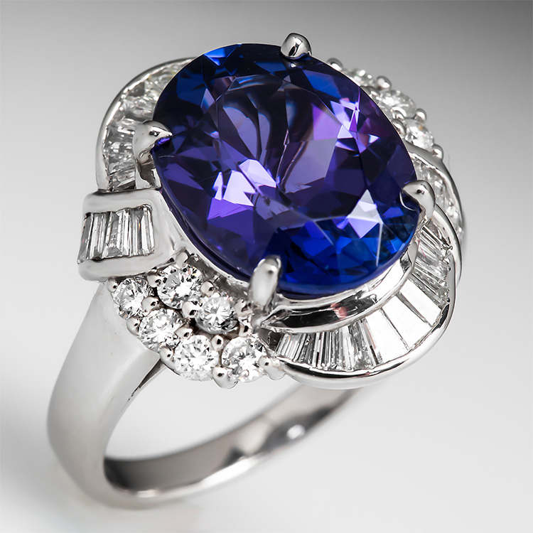 This 5.59 carat (ct) oval tanzanite is surrounded by 28 tapered baguettes and 12 round brilliant cut diamonds.