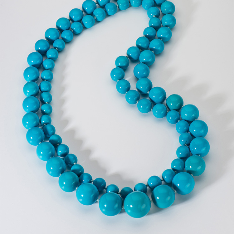 The intense blue turquoise beads in this necklace came from Arizona’s Sleeping Beauty mine.